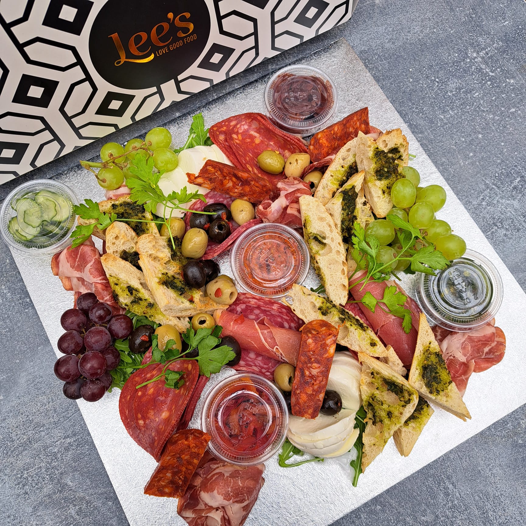 Our antipasto sharing board is full of delicious Italian cols meats, cheeses, olives, sundried tomatoes, grapes, relish, pesto and basil ciabatta.